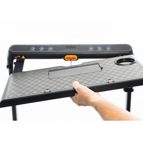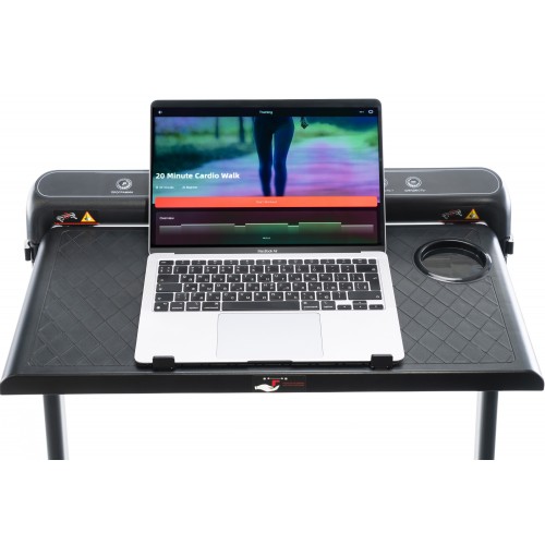 Одна з головних рис Fit-On WorkPlace — висувний робочий стіл , який дозволяє встановити ноутбук, планшет або документи без жодних проблем. Поверхня стільниці має тримач для пляшки води , щоб ви могли підтримувати водний баланс під час тренування.