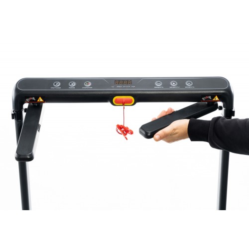 Складна конструкція забезпечує максимальну компактність після завершення тренування – доріжку легко прибрати під ліжко або до шафи. У комплекті є ключ безпеки , який миттєво зупиняє бігове полотно у разі потреби. Така система робить тренування не лише зручними, а й абсолютно безпечними.