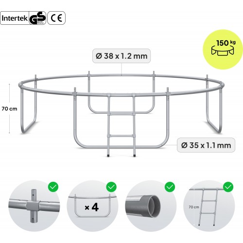 Висота полотна 70 см дозволяє комфортно користуватися батутом, а металева драбинка забезпечує безпечний підйом.