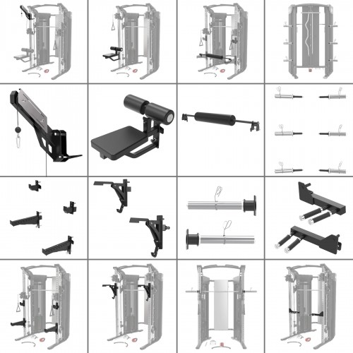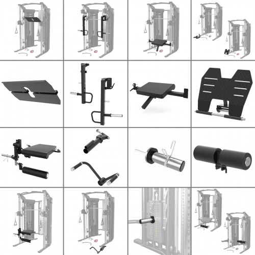 Комплект Cyklop 10 включає багато аксесуарів: подовжувач верхнього блоку, сидіння з фіксатором, пінопластові фіксатори стегон, шість штифтів для зберігання ваг, тримачі для грифа, запобіжні опори, моноліфт, кріплення для грифа Сміта для олімпійських дисків, тримачі для віджимань, пластину для жиму ногами, важелі Jammer, підставку для тяги стегна, пластину для ніг для скручування, сидіння з подовжувачем ніг, ручку Landmine для веслування з хватом, магнітний штифт для додаткових ваг, пружинні затискачі.