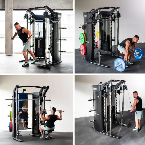 - Повний спектр вправ: від присідань та жиму, через тренажер Сміта, тяги штанги та тяги до тяги з тросом та підтягувань.