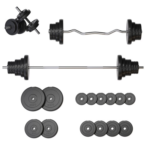 Fit-On 63 кг — універсальний набір для силових тренувань вдома або у невеликому спортзалі. Завдяки широкому вибору дисків і різним типам грифів, ви зможете якісно опрацьовувати всі основні групи м’язів: руки, груди, спину, прес і ноги.