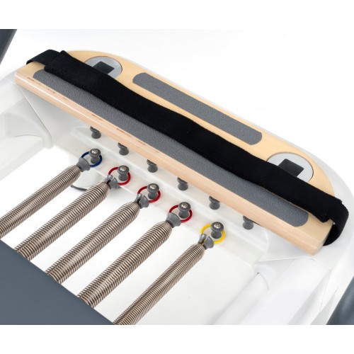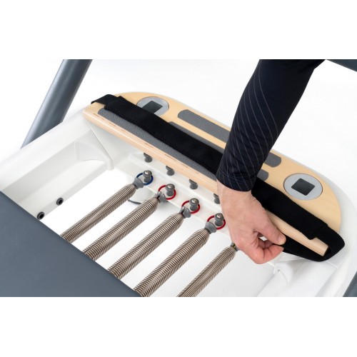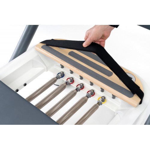 Реформер комплектується широкою коробкою, дошкою для стрибків та системою ременів, що значно розширює спектр доступних вправ та функціональних тренувальних сценаріїв.