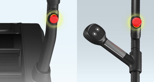 Використовуйте поручні та передню ручку для підтримки під час тренування. За потреби скористайтеся однією з двох кнопок безпеки, щоб негайно зупинити тренажер. Ручки кріпляться у трьох точках, а спеціально вигнуті трубки забезпечують стабільну та надійну підтримку.