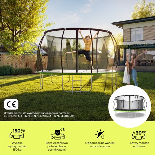 Завдяки тому, що пружини захищені піною та ПВХ-чохлом, батут повністю безпечний у використанні. Цей матеріал також швидко сохне, а це означає, що батут готовий до стрибків одразу після закінчення дощу.