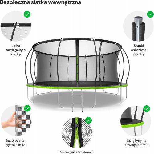Батут ZIPRO Jump Pro PREMIUM має нову, посилену конструкцію з внутрішньою сіткою. Це мінімізує будь-який контакт із зовнішніми компонентами батута. Це дозволяє вам повністю зосередитися на наступному стрибку.