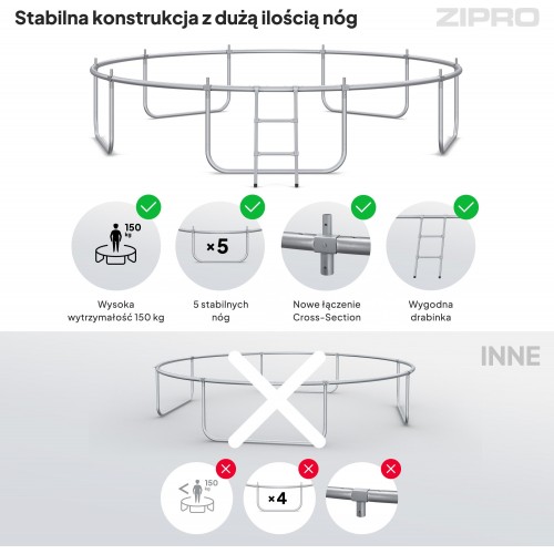 Батут ZIPRO Jump Pro IN має міцну конструкцію. Його вантажопідйомність становить 150 кг, що означає, що ним можуть користуватися дорослі. Відповідна кількість ніжок рівномірно розподіляє навантаження та зусилля, забезпечуючи стійкість та безпеку.