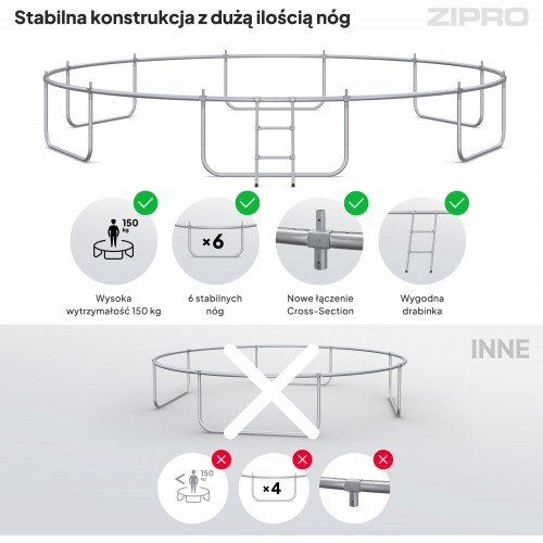 Батут ZIPRO Jump Pro IN має міцну конструкцію. Його вантажопідйомність становить 150 кг, що означає, що ним можуть користуватися дорослі. Відповідна кількість ніжок рівномірно розподіляє навантаження та зусилля, забезпечуючи стійкість та безпеку.