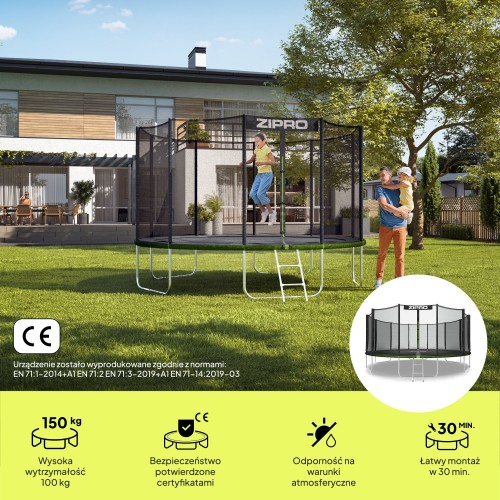 Батут ZIPRO Jump Pro OUT з зовнішньою сіткою був розроблений для того, щоб забезпечити користувачам безтурботне задоволення. Він дуже простий у збірці та надзвичайно міцний, що робить його придатним для тривалого та інтенсивного використання.