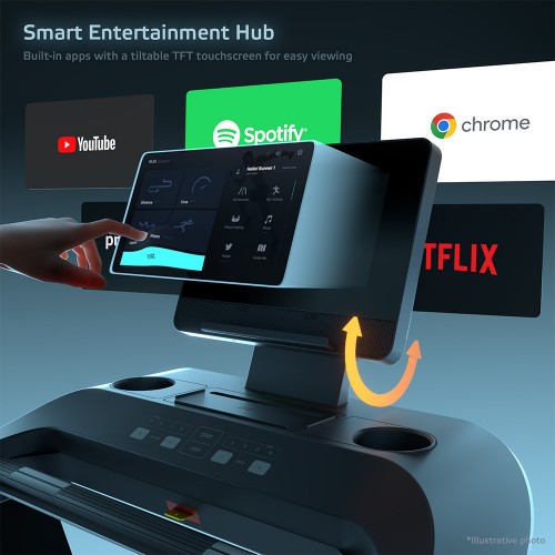 Вас одразу приверне 15,6-дюймовий сенсорний TFT-дисплей , який не лише чітко відображає всі ваші дані тренувань, але й забезпечує розваги під час них. Попередньо встановлені додатки, такі як YouTube, Netflix, Spotify, Facebook, Chrome та Prime Video, зроблять кожну хвилину на біговій доріжці приємнішою. Звичайно ж, є підключення Bluetooth для навушників, бездротова та USB-зарядка телефону , а також елементи керування Touch & Run на ручках для швидкого регулювання нахилу та швидкості.