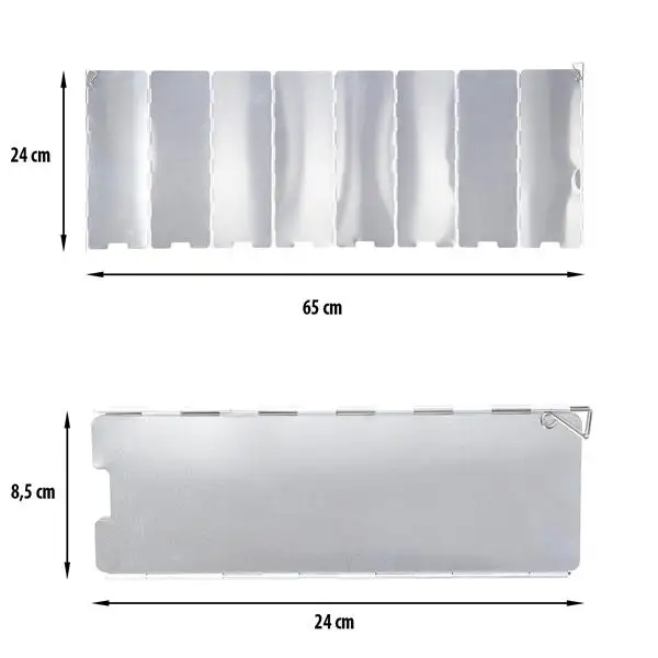Модель складається з8 алюмінієвих панелей, які формують захисний бар’єр навколо пальника. Така конструкція ефективно блокує вітер і зберігає постійну температуру полум’я. Це особливо важливо при приготуванні страв у горах, лісі чи під час вітряної погоди. До комплекту входять спеціальнішпильки для фіксації в ґрунті, що забезпечують стійкість конструкції.