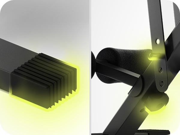 Механічний замок запобігає випадковому складанню під час тренування, а протиковзкі ніжки захищають підлогу та забезпечують міцний контакт із землею.